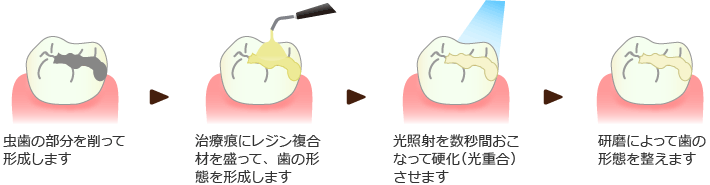 光に反応して硬化する性質(光重合)を持つ軟性レジン(プラスチック材)を塗り固めながら歯の形態を修復(積層法)する治療です。インレー(修復物を詰める治療)に比べ短期間に治療を終えることができます。
